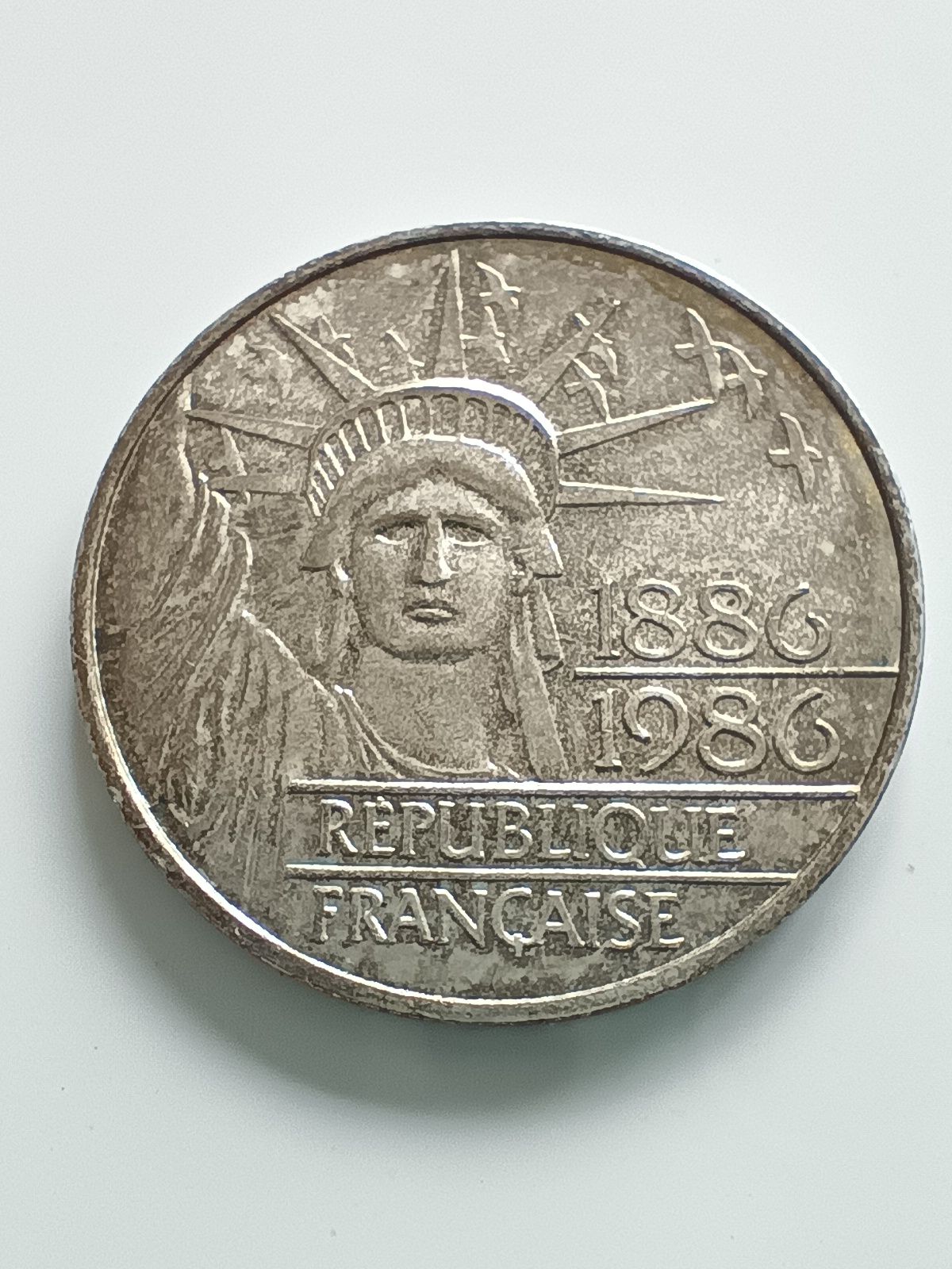 * Avers : Représentation de la Statue de la Liberté, les dates “1886-1986” et l’inscription “RÉPUBLIQUE FRANÇAISE”.